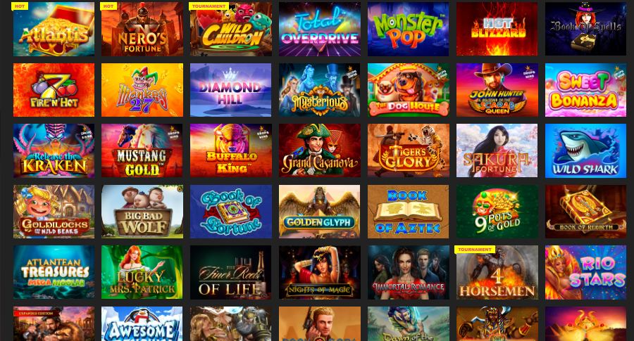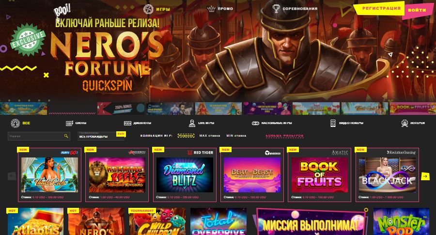 - Игры:Более 1500 слотов, настольные и карточные игры, Live-casino, видео-покер, лотереи