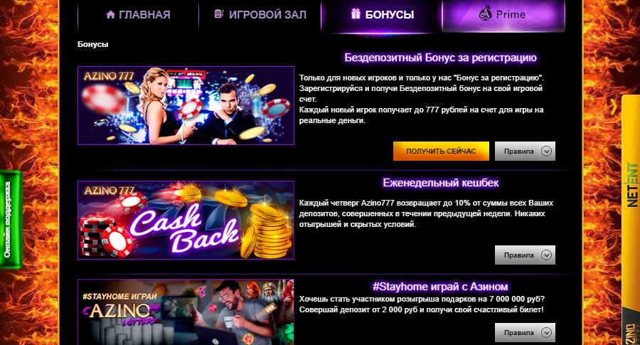 Заведение привлекает участников не только популярными играми и увлекательными аппаратами, но и бездепозитными бонусами за регистрацию — 777 рублей. Также заведение предлагает поощрения за внесение первого депозита, подарками в день рождения и кэшбэком до 15%.